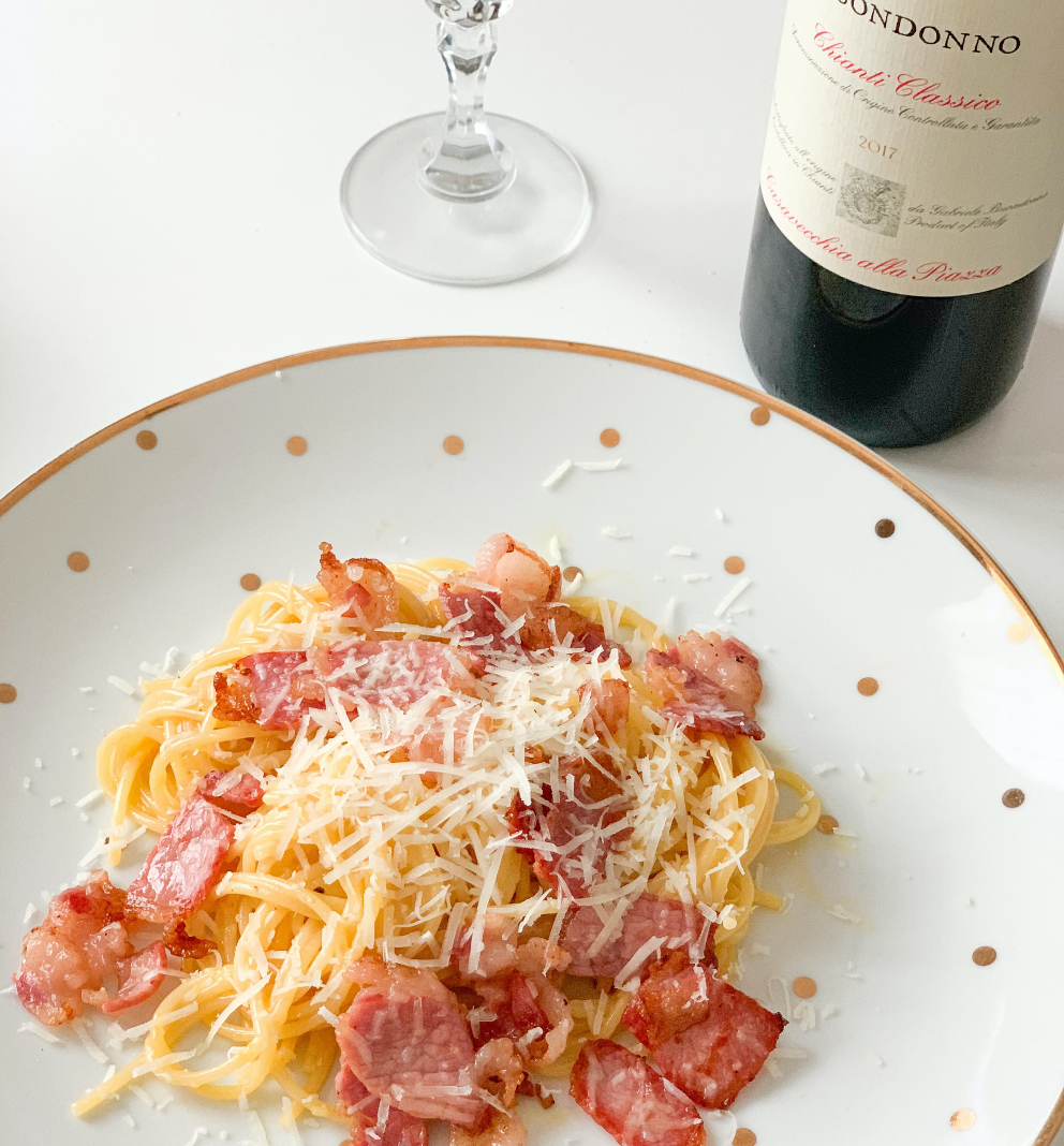 Le vin est souvent servi avec des pâtes pour compléter le repas.